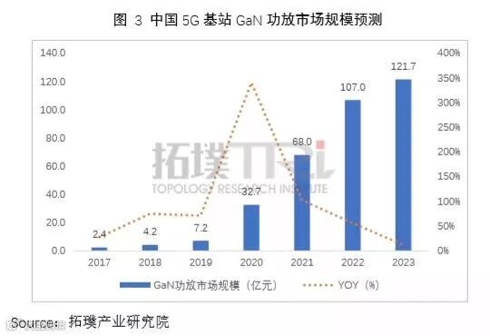 2019 年为中国 5G 建设元年,基站端 GaN 放大器同比增长达 71.4%;2020 年为 5G 建设爆发年,基站端 GaN 放大器市场规模达 32.7 亿元,同比增长 340.8%;预计到 2023 年基站端 GaN 放大器市场规模达 121.7 亿元,但 2021~2023 年同比增速逐渐下降。