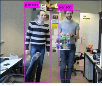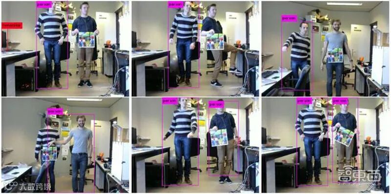 如图,右边的人身上挂了一块彩色贴纸,这张贴纸成功欺骗了AI系统,使他即便正面摄像头,也没有像左边的人那样被AI系统检测出来(粉色框)。
