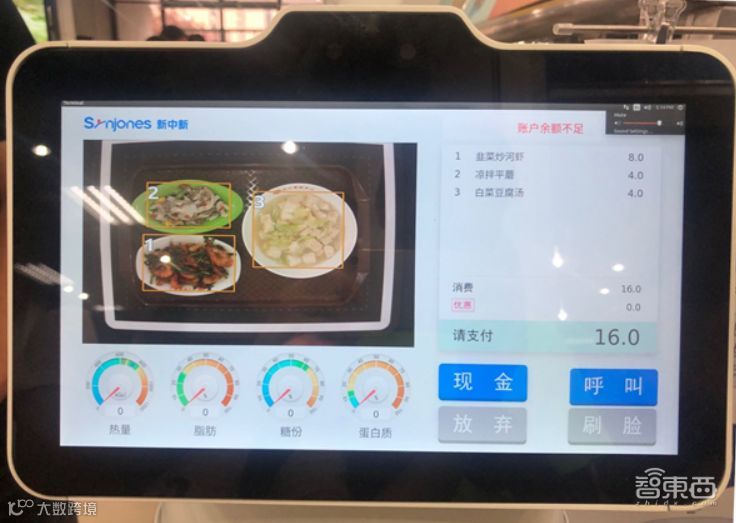 智东西打了韭菜炒河虾、凉拌平蘑和白菜豆腐汤三个菜,将餐盘放到机器人托盘上后,机器收银员在2秒钟左右就立马识别出菜品,同时要求支付16元,整个过程一气呵成。