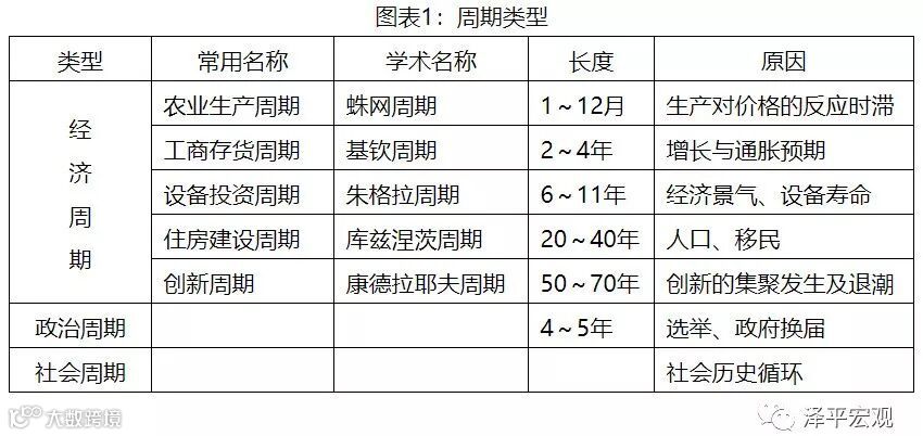现代经典经济周期理论归纳出了几大典型商业周期:短波的农业周期(又称蛛网周期)揭示的是农业对价格的生产反馈周期,1年左右;中短波的库存周期(又称基钦周期)揭示的是工商业部门的存货调整周期,3年左右;中长波的设备投资周期(又称朱格拉周期)揭示的是产业在生产设备和基础设施的循环投资活动,10年左右;长波的建筑周期(又称库兹涅茨周期)主要是住房建设活动导致的,30年左右;超长波的创新周期(又称康德拉耶夫周期)是由创新活动的集聚发生及退潮所致,60年左右。