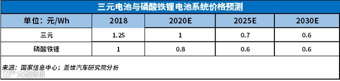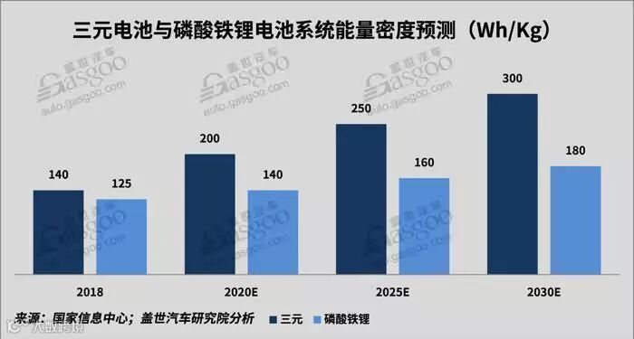 三元电池有望2020年系统能量密度接近200Wh/kg,2025年接近250Wh/kg;而磷酸铁锂系统能量密度已接近极限,但相对于三元材料具备价格优势。