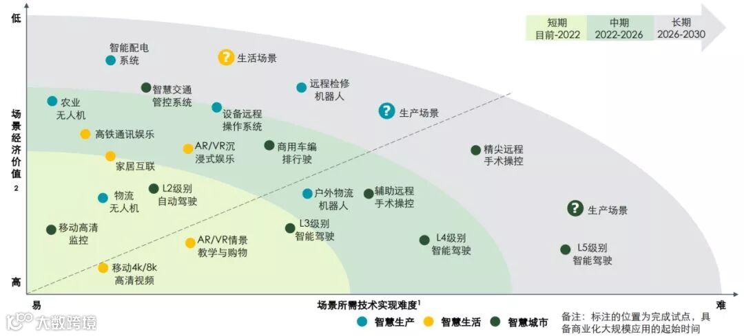 增强移动宽带类的应用场景将优先落地在高用户密度的区域,因其总体技术相对成熟、经济价值也大。随着时间的推移,更多的技术壁垒将被打破,5G赋能带来的经济价值也将在更多场景凸显。