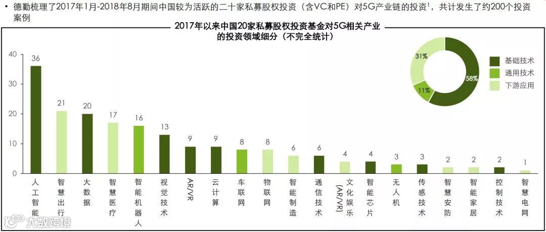 中国私募股权投资基金对5G相关产业的投资以基础技术为主,其次是下游应用。人工智能、大数据、视觉技术是基础技术的投资热点,智慧出行和智慧医疗是下游应用的投资热点。