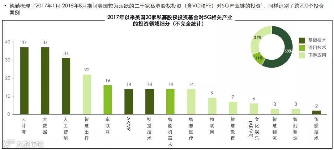 美国私募股权投资基金对5G相关产业的投资热度呈现出高度的相似性,但对基础技术的投资相对均衡,智慧出行与智慧医疗同样是下游应用的投资热点。