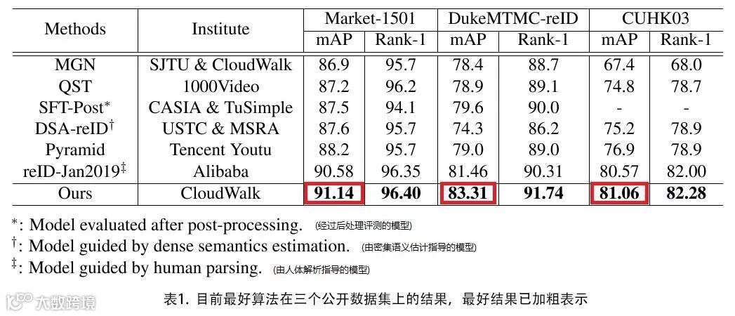这是继去年云从科技刷新跨镜追踪技术世界纪录后,再一次在该领域领跑全球。本次云从科技研究团队在三大数据集的两大核心指标mAP与Rank-1准确率上均取得第一,其中在Market-1501数据集上的mAP远超目前业内顶尖水平, 达到了惊人的91.14%。