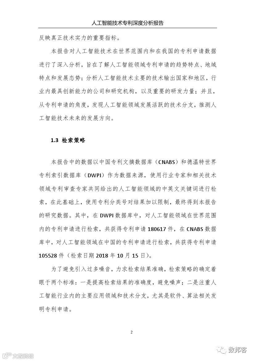 本报告中的数据以中国专利文摘数据库(CNABS)和德温特世界专利索引数据库(DWPI)作为数据来源,使用行业专家和相关技术领域专利审查专家共同给出的人工智能领域的中英文关键词进行检索,在此基础上,使用专利分类号对结果加以限制,最终得到本报告的研究数据。其中,检索策略的确定着眼于两条标准:一是提高检索结果的准确度,避免噪声;二是注重人工智能行业内的主要应用领域和技术分支,尤其是软件、算法相关发明专利申请。