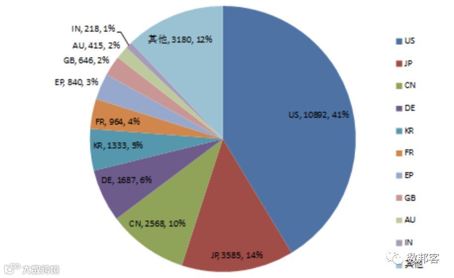 课题组对各个国家/地区的人工智能领域专利申请量进行统计,排名前十位的国家/地区依次为中国、美国、日本、韩国、欧洲(指在欧专局直接提出申请)、德国、澳大利亚、台湾、加拿大和印度。其中排名首位的中国专利申请量为76876件,略高于美国的67276件,排名第三的日本有44755件。