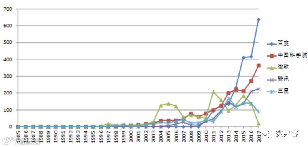 通过对世界范围内申请人关于人工智能技术在国内的专利布局分析,超过半数还是国内的公司和高等院校,得到申请量排名前五的申请人依次为百度、中国科学院、微软、腾讯和三星。这几位申请人的申请量年度变化趋势如图4所示。