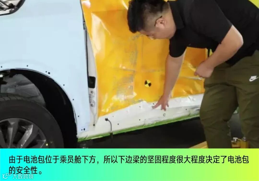 从外观上看,碰撞后的试验车前后侧门板都有不同程度的受损,下边梁上方的钣金有些许的翘曲。但整个下边梁主体并没有明显变形。