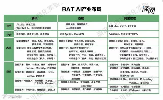 作为国内AI产业最重要的参与者,互联网巨头BAT在AI技术、平台、应用场景和对外投资层面都已完成了全方位的布局,BAT专注的业务领域也反应到了其在AI产业的布局上,总体来说,百度围绕平台与自动驾驶;阿里侧重人工智能在数据服务领域的应用和底层技术;腾讯侧重平台和技术开放,对外均衡布局。