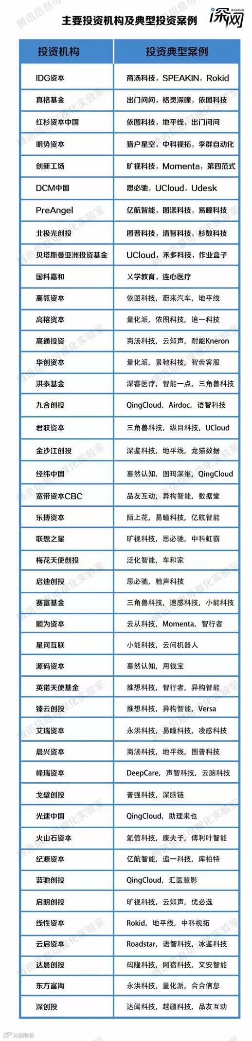 人工智能赛道涵盖了中国各大主流投资机构,包括真格基金、红杉资本中国、IDG、创新工场等基金和腾讯、阿里、百度、联想等产业资本。