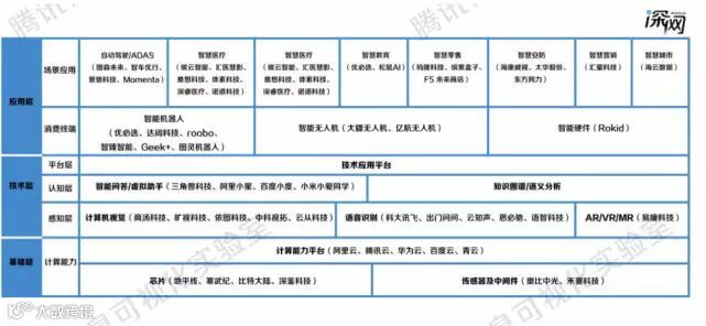 应用层则是具体的消费级终端应用和行业场景应用,消费级终端应用包括智能机器人、智能无人机以及智能硬件三个方向;行业场景应用对接各类外部行业的AI应用场景,如自动驾驶、智慧金融、智慧医疗、智慧教育、智慧零售、智慧安防、智慧营销、智慧城市等等。