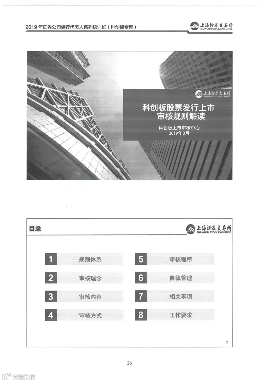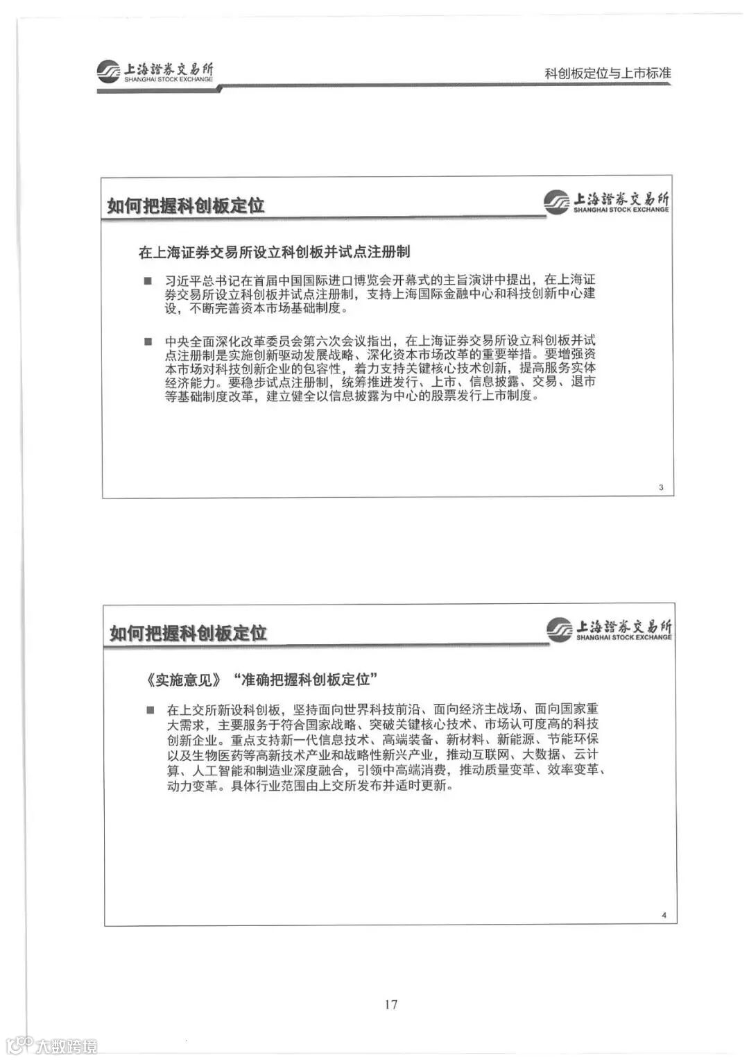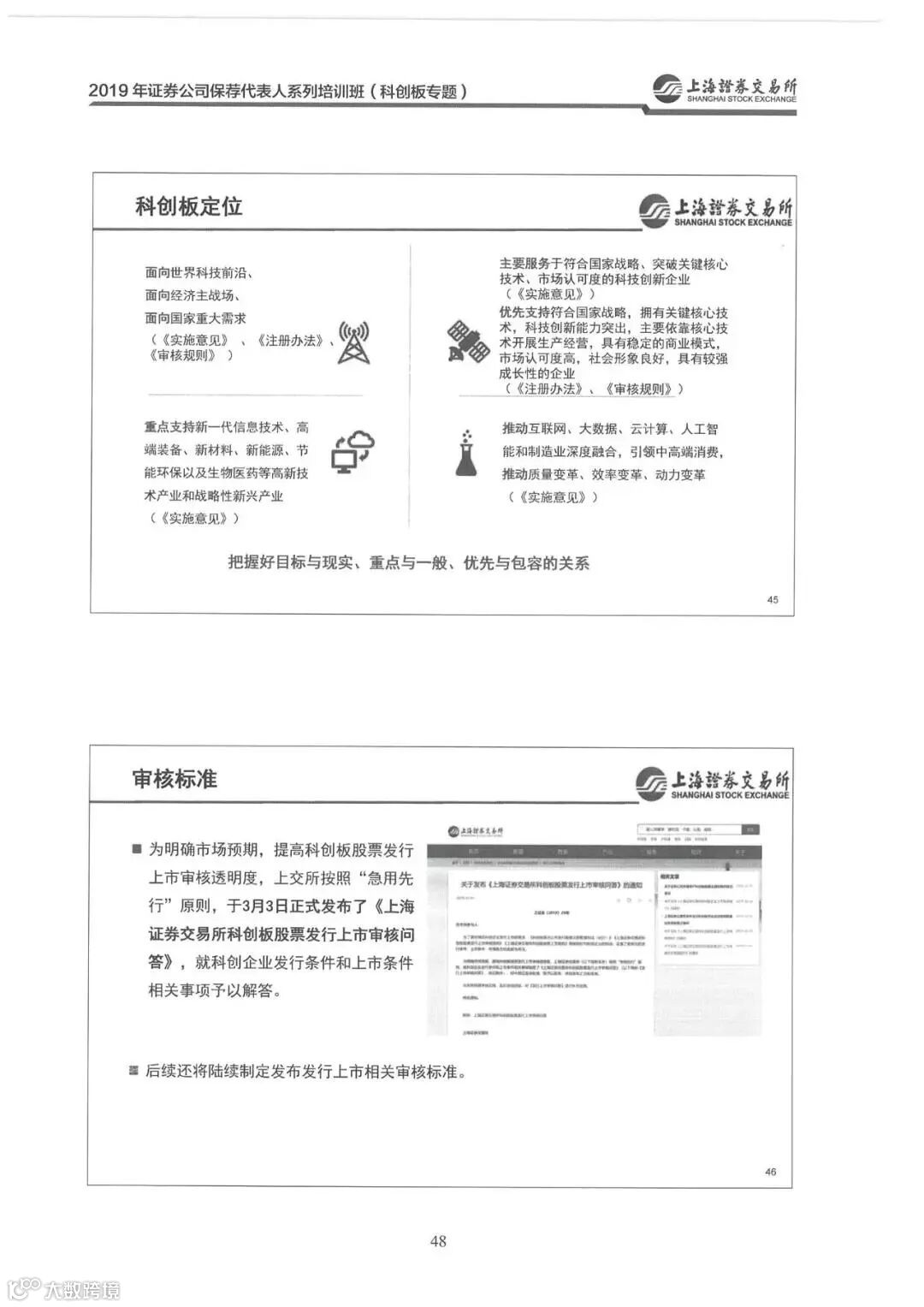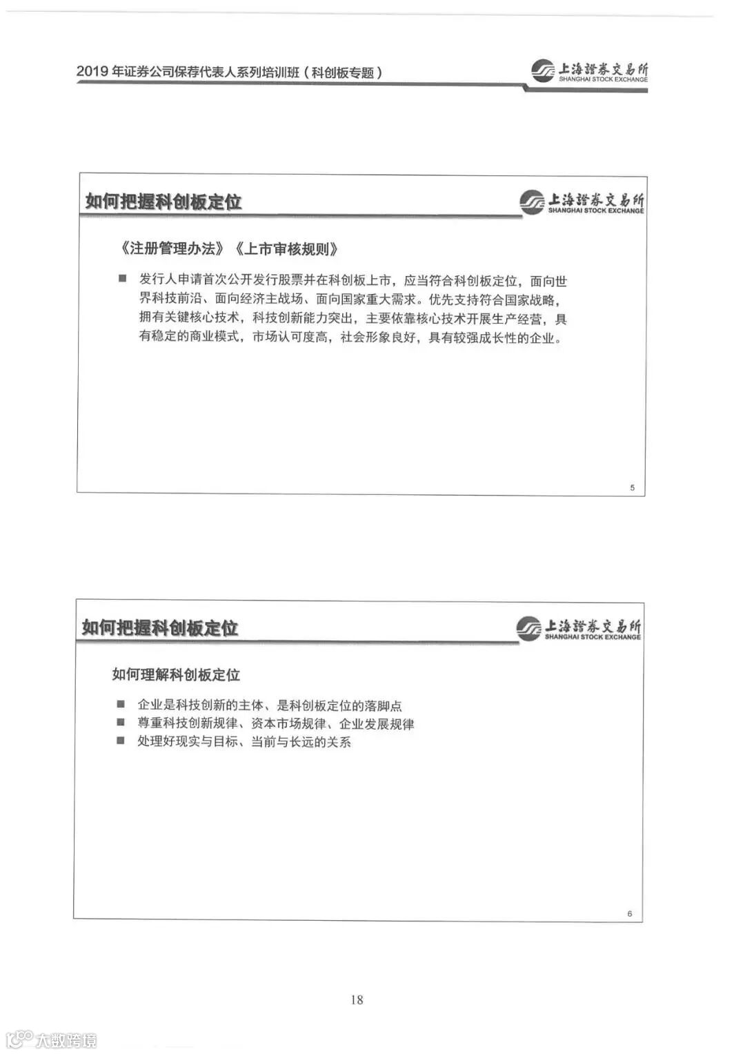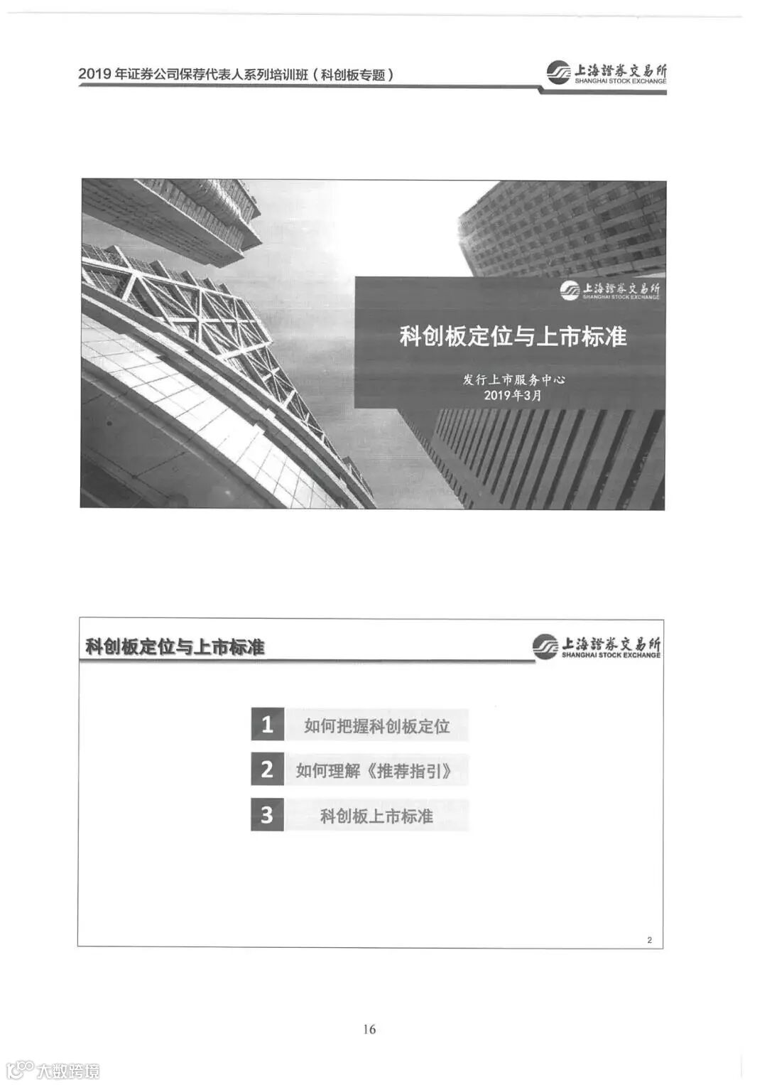 当日的培训内容公分为五部分,分别包括,设立科创板并试点注册制实施意见概述、科创板首次公开发行注册管理办法和信息披露规则讲解、科创板定位与上市标准、科创板审核规则解读、科创板审核问答解读、上交所多位负责人到场对科创板申报流程、审核关注点等市场关注的内容进行了详细讲解。
