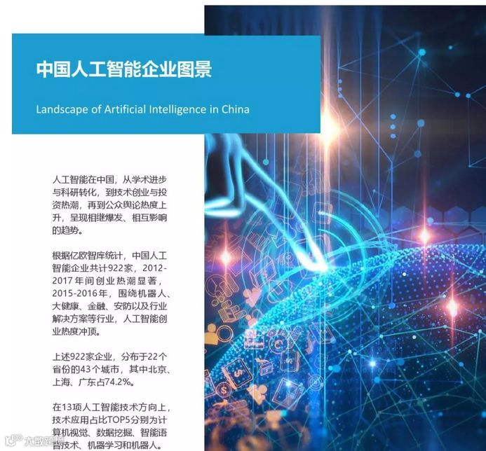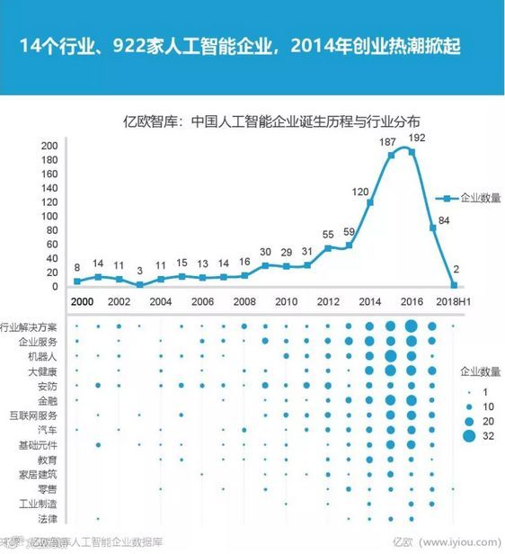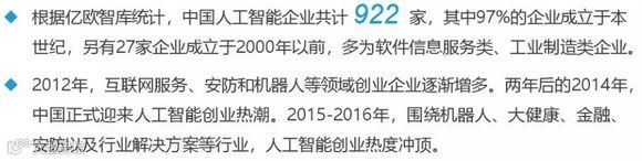 根据亿欧智库统计,中国人工智能企业共计922家,2012-2017年间创业热潮显著,2015-2016年,围绕机器人、大健康、金融、安防以及行业解决方案等行业,人工智能创业热度冲顶。