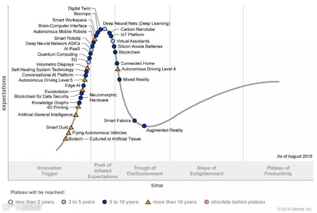关于未来几年的技术节奏点,我们可以参考一下Gartner公司在2018年8月发布的这条曲线: