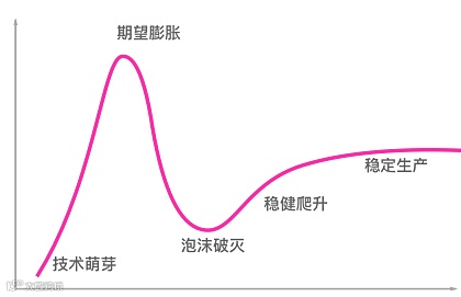 按照Gartner公司的说法,这个节奏点一般分为5个阶段:科技诞生的萌芽期、过高期望的膨胀期、泡沫化的低谷期、稳步爬升的光明期、稳定生产的高原期。如果画成图的话,这个曲线又可以叫炒作周期曲线。