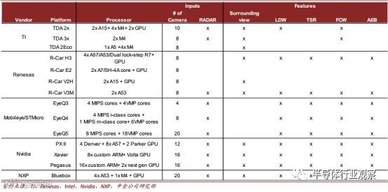 传统车载半导体厂商积极布局自动驾驶。 近些年来,各传统车载半导体供应商纷纷涉猎自动驾驶业务,推出了各自的自动驾驶,或辅助驾驶平台,如 TI 推出了面向于 L1/2 级的平价产品,而 Renesas 和 NXP 步入中高端市场。 V3M 与 Bluebox 分别是两家的代表性产品,均满足客户 L3 级自动驾驶需求。目前 NXP 的 Bluebox 2.0 也在测试中。