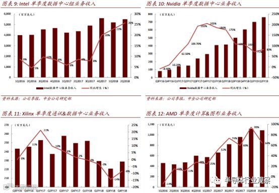 虽然深度学习任务主要由 GPU 承担,但 CPU 目前仍是云计算芯片的主体。 Intel 于 2015年底年收购全球第二大 FPGA 厂商 Altera 以后,也积极布局 CPU+FPGA 异构计算助力 AI,并持续优化 Xeon CPU 结构。 2017 年 Intel 发布了用于 Xeon 服务器的,新一代标准化的加速卡,使用户可以 AI 领域进行定制计算加速。得益于庞大的云计算市场支撑, Intel 数据中心组业务收入规模一直位于全球首位, 2016-17 年单季保持同比中高个位数增长。 2017年 4 季度起,收入同比增速开始爬坡至 20%左右,但相比 Nvidia 的强劲增长态势仍有差距。