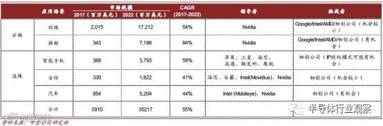 ► 云端训练芯片市场规模在 2022 年将达到 172 亿美元, CAGR~54%。