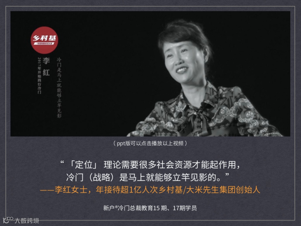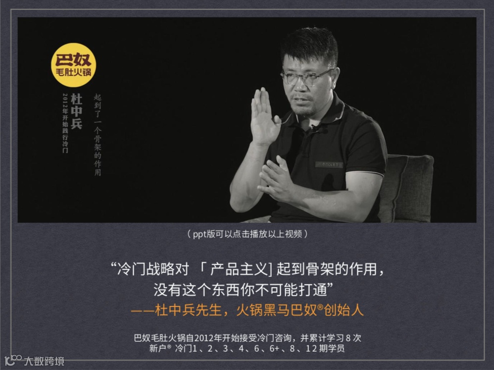 我们这里,网罗的是一批长期不依赖圈层、不依赖人脉、不依靠打折、促销、不盲目求大,也能获得增长、一步步创造独特价值产品的企业家。许多有成果的企业家,在复训收费的情况下,也会不断的来到冷门战略反复学习与践行。