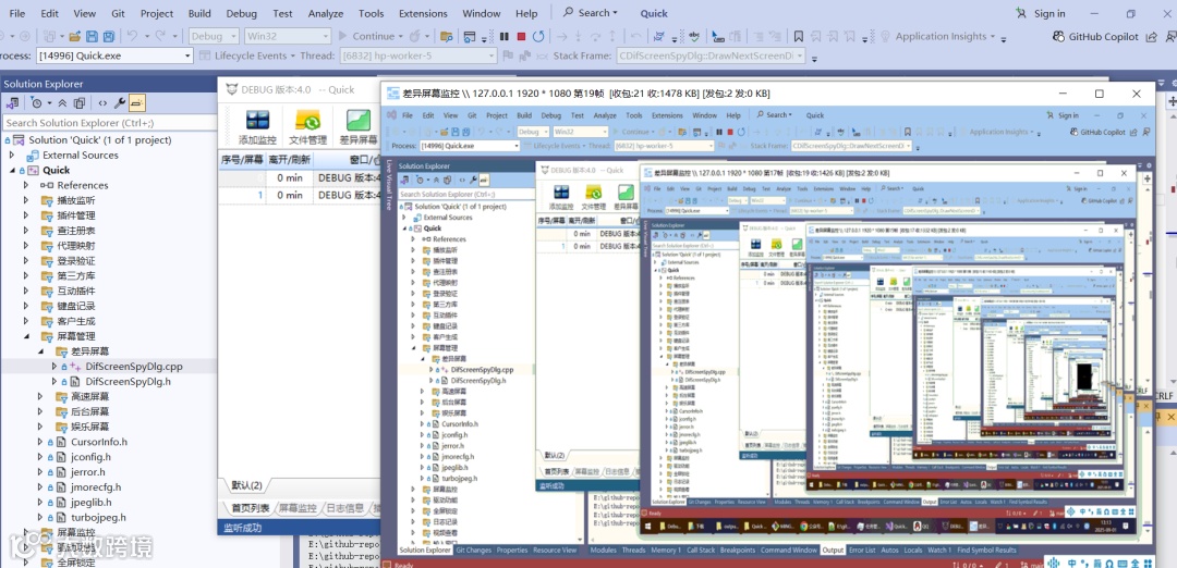 其中前三种屏幕都是获取被控端桌面的内容展示出来,只不过屏幕传输算法不一样,例如差异屏幕是传输远程屏幕图像中发生变化的部分,高速屏幕把屏幕数据压缩成有损JPEG,压缩比例可以调整,压缩后的数据相比较原始数据小很多,所以传输起来,速度非常快。