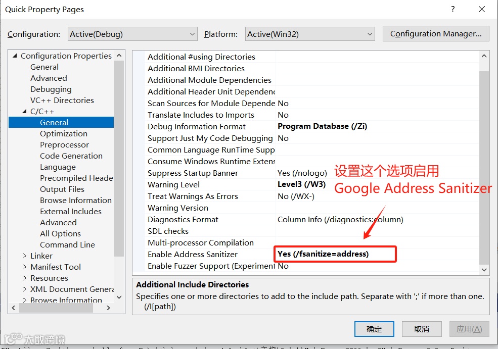 于是,果断在项目中启用 Google Address Sanitizer,打开项目的工程属性设置,在这个启用: