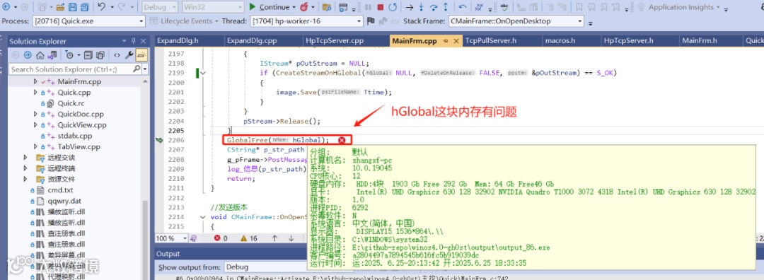 这行有内存问题,那么也就意味着hGlobal这个内存句柄有问题。