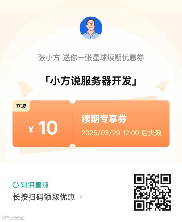 专栏今晚会在小方说服务器开发知识星球上线。对这个专栏有兴趣的小伙伴可以通过下面的二维码扫码加入(原价325一年,扫码立即优惠40元):