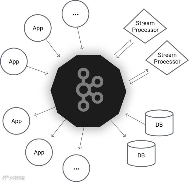 基于生产者消费者理论模型的队列系统在实际开发中实在是太常用了,以至于在一组服务中可能每个进程都需要一个这样的队列系统。既然如此,出于复用和解耦的目的,业界产生了许多独立的队列系统,这些队列系统或以一个独立的进程运行或以支持分布式的一组服务运行。我们把这种独立的队列系统称之为消息中间件。这些消息中间件在功能上做了丰富的扩展,如消费的方式、主备切换、容灾容错,数据自动备份和过期数据自动清理等等,比较典型的有 Kafka、ActiveMQ、RabbitMQ、RocketMQ 等。下图是 Kafka 官网提供的一张介绍 Kafka 作用的图片: