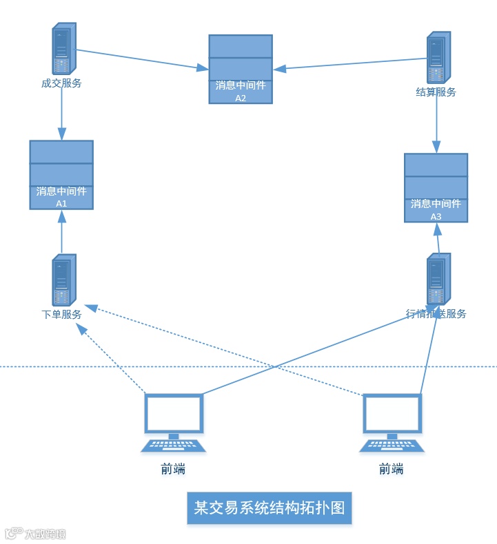 下图是笔者开发过的一个金融交易系统后台服务拓扑图,其大量使用消息中间件 kafka: