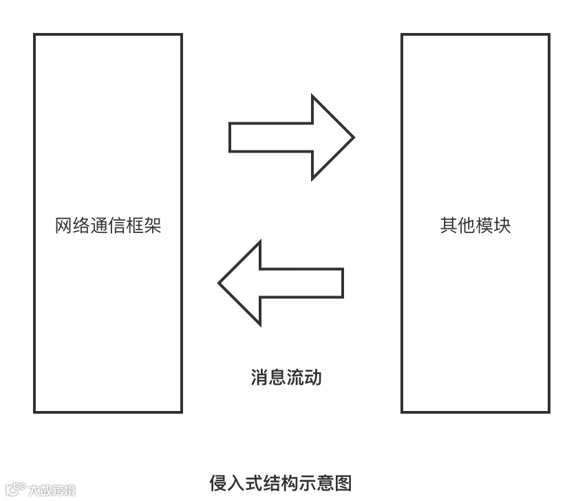 假设网络通信框架结构一定的情况下,根据通信数据是否从网络框架中流入流出,我们将服务器的结构分为侵入式和非侵入式两种。