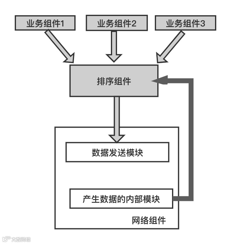 那么对于有多个数据源且数据源之间的数据有顺序依赖,有没有办法继续使用方法一呢?有的,你可以在多个数据源处理完数据后,交给一个专门将数据源排序的组件,再由排序组件统一调用网络组件的数据发送模块。需要注意的是,网络组件内部产生的需要发送的数据也要交给排序组件。示意图如下: