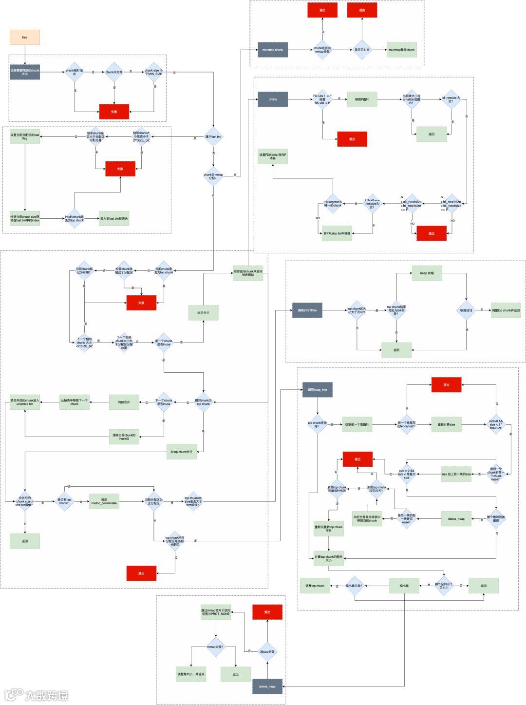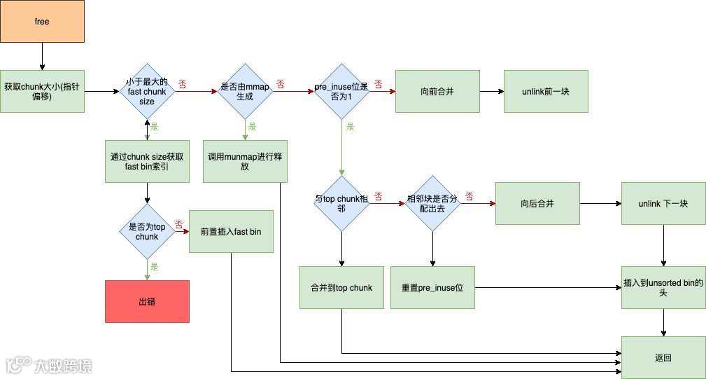 如果将free函数内部各种条件加入进去,那么free调用的详细流程图如下: