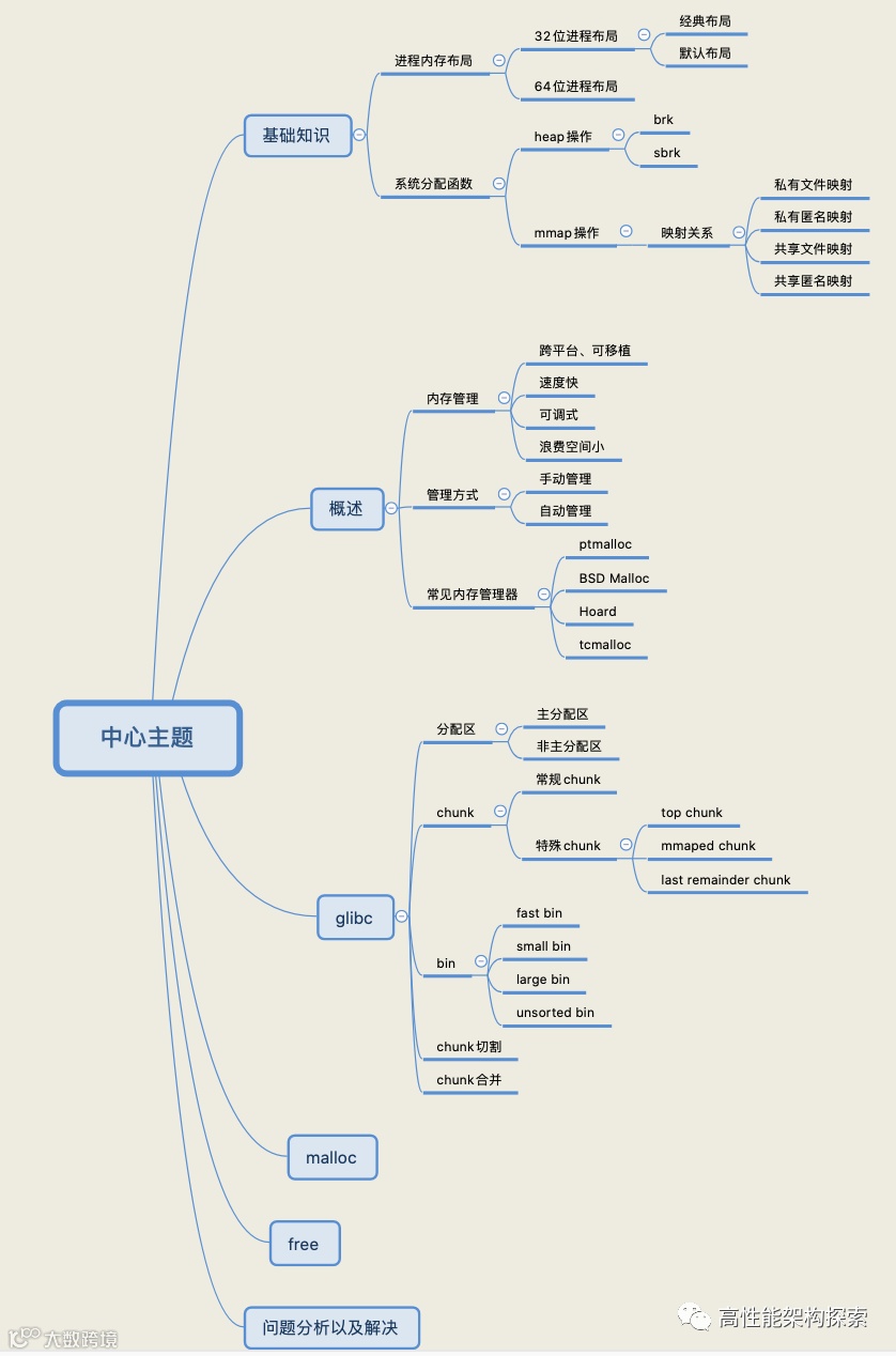 接下来的内容,干货满满,对于你我都是一次收获的过程。主要从内存布局、glibc内存管理、malloc实现以及free实现几个点来带你领略glibc内存管理精髓。最后,针对项目中的问题,指出了解决方案。大纲内容如下: