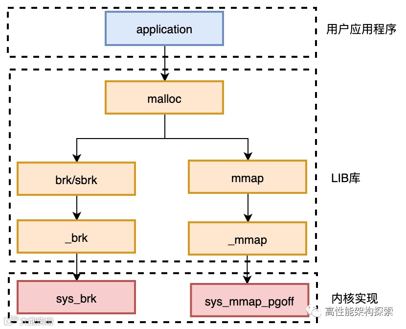 C语言的动态内存分配基本函数是 malloc(),在 Linux 上的实现是通过内核的 brk 系统调用。brk()是一个非常简单的系统调用, 只是简单地改变mm_struct结构的成员变量 brk 的值。