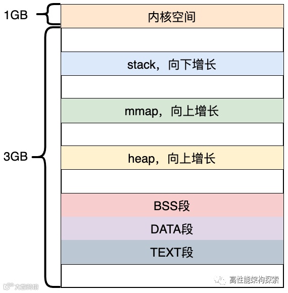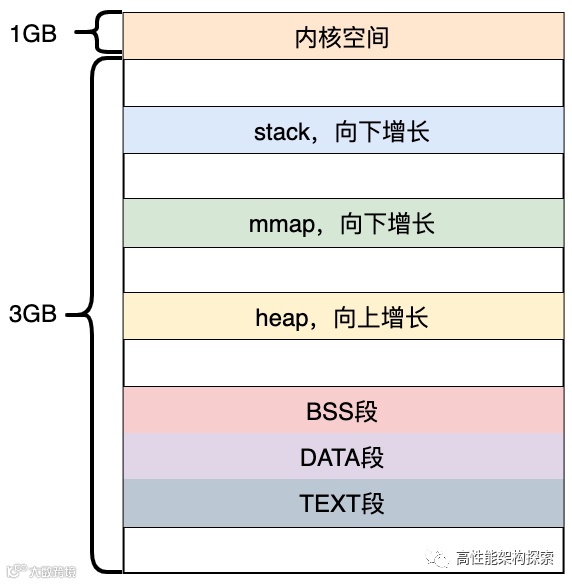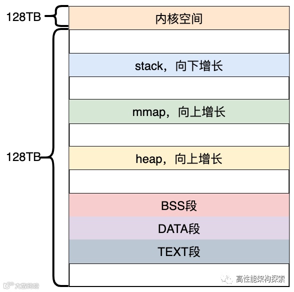 在该内存布局示例图中,mmap 区域与栈区域相对增长,这意味着堆只有 1GB 的虚拟地址空间可以使用,继续增长就会进入 mmap 映射区域, 这显然不是我们想要的。这是由于 32 模式地址空间限制造成的,所以内核引入了另一种虚拟地址空间的布局形式。但对于 64 位系统,因为提供了巨大的虚拟地址空间,所以64位系统就采用的这种布局方式。
