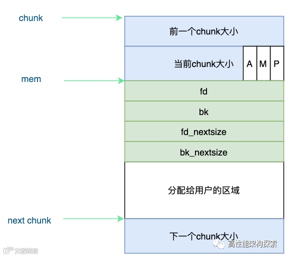 大小大于等于512字节的chunk被称为large chunk,而保存large chunks的bin被称为large bin,位于small bins后面。large bins中的每一个bin分别包含了一个给定范围内的chunk,其中的chunk按大小递减排序,大小相同则按照最近使用时间排列。