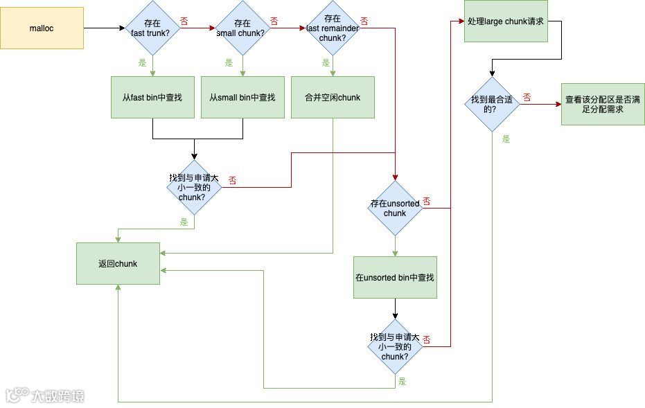 判断是否为第一次调用 malloc,若是主分配区,则需要进行一次初始化工作,分配一块大小为(chunk_size + 128KB) align 4KB 大小的空间作为初始的 heap。若已经初始化过了,主分配区则调用 sbrk()增加 heap 空间,分主分配区则在 top chunk 中切割出一个 chunk,使之满足分配需求,并将内存指针返回给用户。