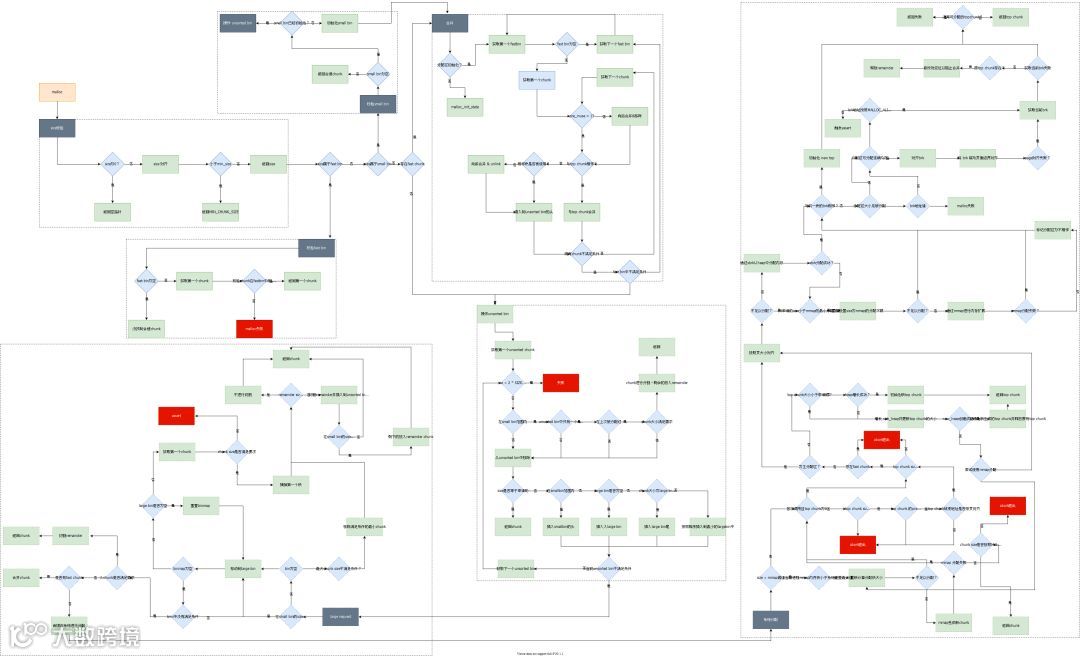 当然了,glibc中malloc的分配远比上面的要复杂的多,要考虑到各种情况,比如指针异常ΩΩ越界等,将这些判断条件也加入到流程图中,如下图所示: