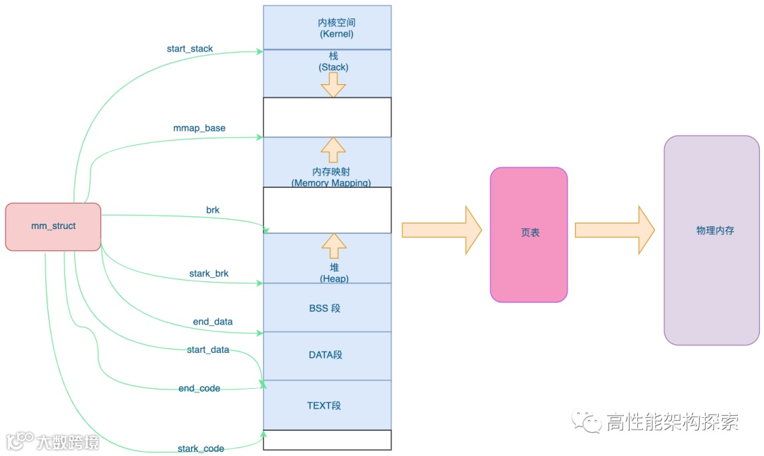 进程的内存结构,在内核中,是用mm_struct来表示的,其定义如下: