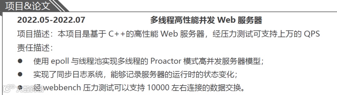 为了让大家可以感同身受,我截取了两份真实应届生求职 C++ 岗位的简历中项目描述,你可以自己先想一想,如果在简历中这样描述项目,面试时可能会被问到哪些问题。