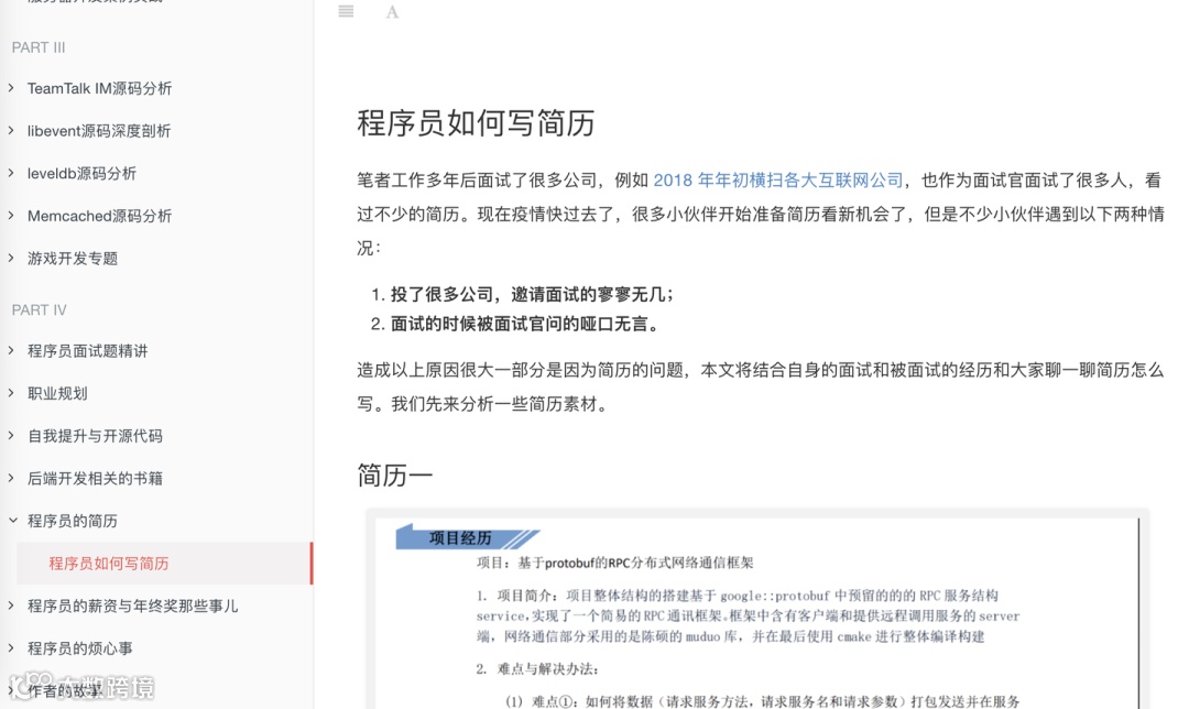 如果有项目,一定要真实合理。所谓真实是你写到简历中的项目一定是真实的,即你参与或者熟悉的,不反对包装开源项目作为自己的项目,但一定要把项目的核心内容和程序的核心原理细节搞清楚,让面试官相信你真的参与了这个项目。举个例子,如果你的项目是 Web 服务器,那么如果你连 HTTP 协议格式都不清楚,面试官如何相信这个 Web 服务器是你自己做的呢?如果你的项目中使用了 protobuf 协议,但你连 protobuf 如何做到协议兼容和扩展都不清楚,那把这样的项目写到简历中,意义就不大。所谓合理是说,项目的技术实现描述要合理,比如上文中支持万级 QPS 而不给出具体硬件配置,显然不合理的;说自己调试过项目,连基本调试命令都说不清楚,显然难以自圆其说。这里有一位包装项目翻车的同学。