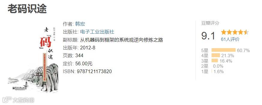 汇编实战类图书还有另外一本《老码识途:从机器码到框架的系统观逆向修炼之路》。我个人是非常喜欢这本书的。我上学的时候发现这本书欣喜之致,连着我在宿舍读了两个星期,将这本书读完。
