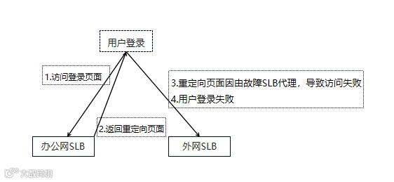 事后复盘发现,用户在登录内网鉴权系统时,鉴权系统会跳转到多个域名下种登录的Cookie,其中一个域名是由故障的SLB代理的,受SLB故障影响当时此域名无法处理请求,导致用户登录失败。流程如下: