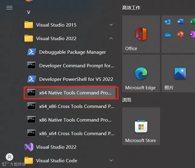 我们这里想编译 64 位版本的 Nginx,因此在电脑开始菜单选择 64 位版本的命令行工具以管理员权限启动: