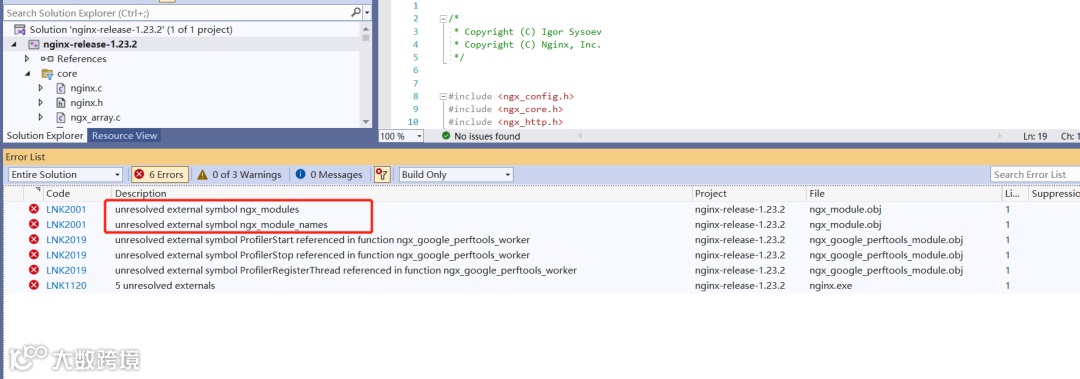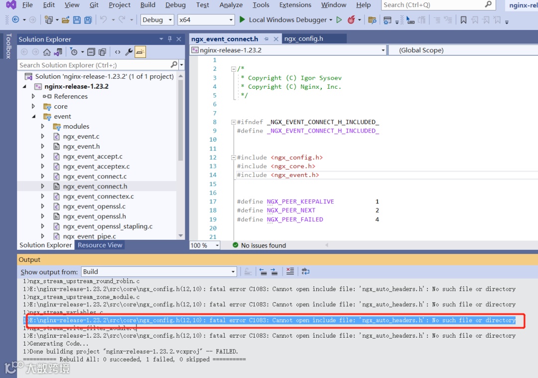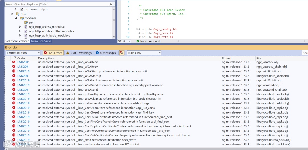 配置好之后,我们尝试编译 Nginx 工程,发现报如下错误: