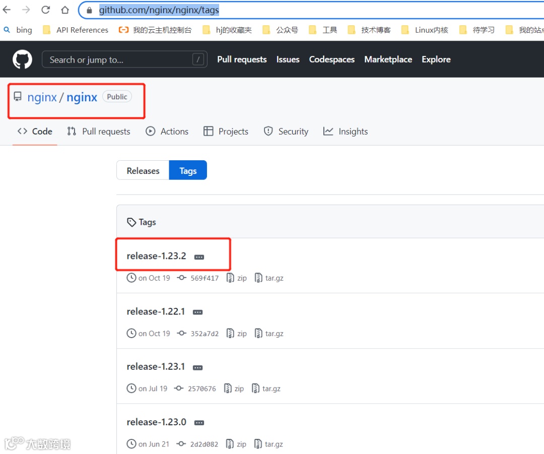 或者在 github Nginx 仓库 https://github.com/nginx/nginx/tags 已经发布的 tags 中下载一个源码包: