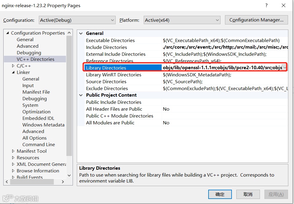 在前面步骤,我们已经生成了 zlib、openssl、pcre2 对应的 lib 文件,我们也需要把他们添加到 VS 的工程 Library 目录,一共两个地方: