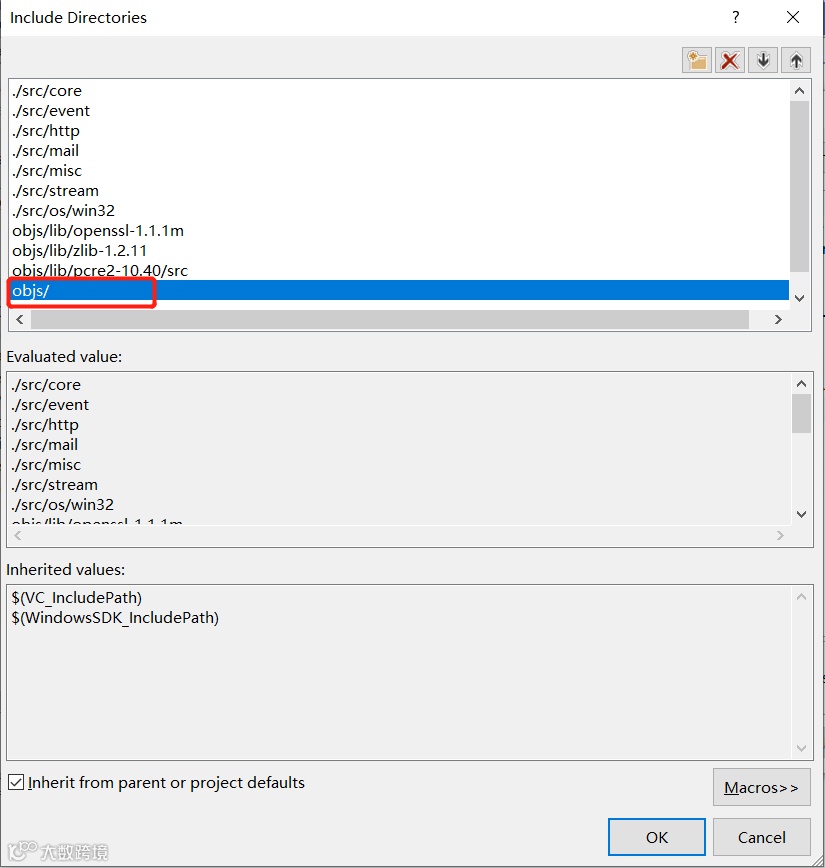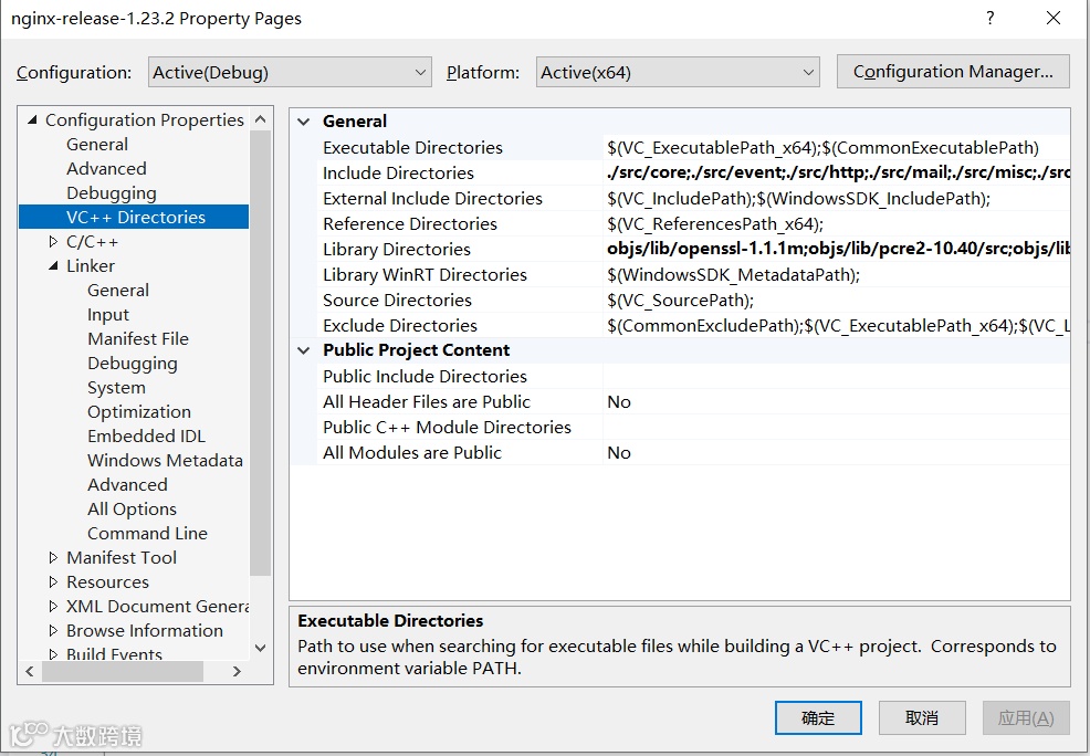 因此,我们需要把这些目录加入到工程的 include 目录,同时 Nginx 依赖 zlib、openssl、pcre2 三个库,我们也需要这三个库的头文件也添加到 工程的 include 目录。