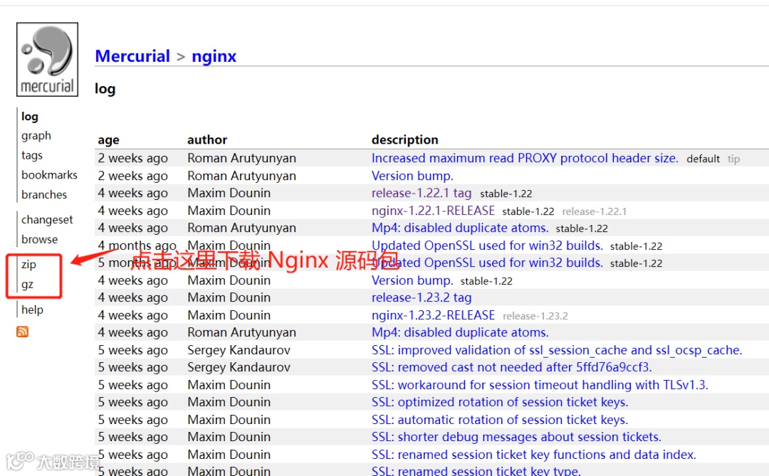 浏览器中访问 http://hg.nginx.org/nginx 这个链接,在左侧导航栏中 zip 或者 tar 包链接中选择一个版本下载: